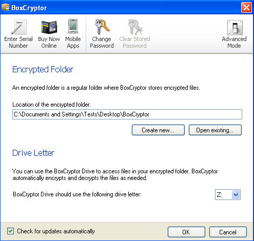 This is the default window of BoxCryptor and as you can see the interface is very easy to understand and there’s not a lot of options to confuse people. Everything that you need for having an encrypted folder is right there in the BoxCryptors main page. There’s also the option for opening up the Advanced mode at the upper right corner which offers more options for those willing to tinker with this encryption program.