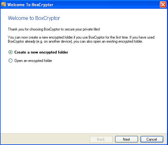 Here you are given the option to either create a new encrypted folder or to open an existing encrypted folder. Creation of the encrypted folder is very easy, all the input that is required from the user is to designate a location where the encrypted folder will be saved, and to enter the password with which the folder will be protected. Simple to follow wizard takes care of all this, and there’s no need to explain it in a lot of detail. Once you’re finished, BoxCryptor will automatically mount your encrypted folder as a virtual partition, exactly the same thing that we saw TrueCrypt do: