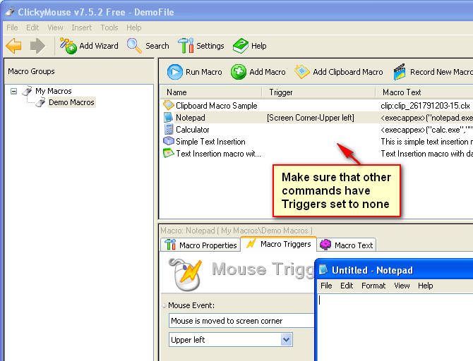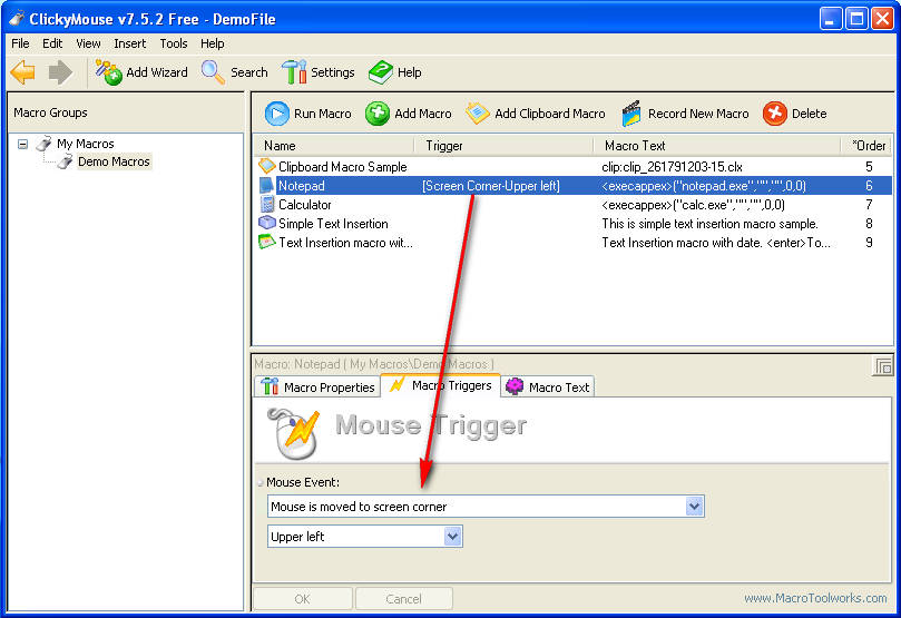 After selecting the command that you want from the list, on the bottom part of the program area you will be presented with Macro properties, triggers and text options. For now just select the Trigger tab. In the Mouse Event tab Mouse is moved to the screen corner should be selected and on the window below that select which corner will activate the command. The corner that you pick will be where the command will be executed after you set your mouse pointer into it, we tried it and it really works.