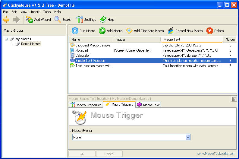Macro recording is offered by Word for example, there you can record a task that you need to repeat over and over again so that you don’t have to do it, just set the program and it will execute that action, ClickyMouse works on the same principles, only it’s introduces the mouse and puts it in the role of the trigger for a pre-recorded command.