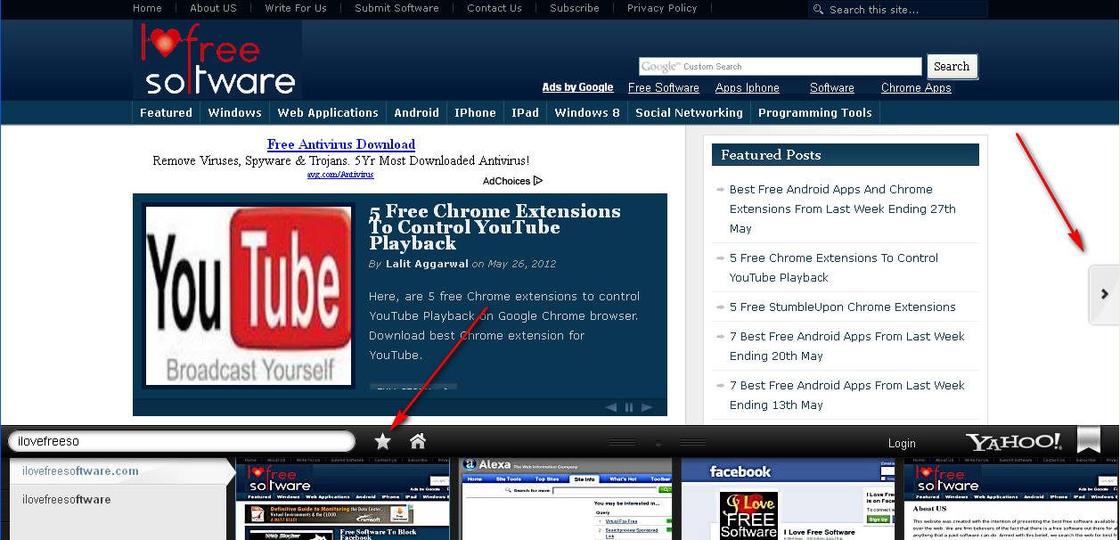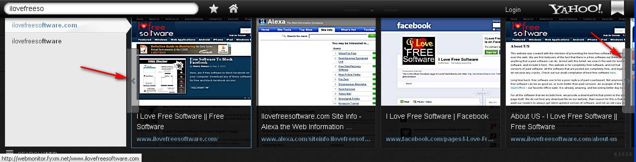 The results are accompanied with site screenshots, as you can see on the image above. The red arrows on the image are pointing to page turners, which you can use to go through all the results. When a web page is opened, Yahoo Axis is still present and now you’ll be offered with an option to add the website that you have opened to Favorites on your Yahoo Axis homepage and you also get a small button on the side of your screen which you can use to switch directly to the next result in your search result list: