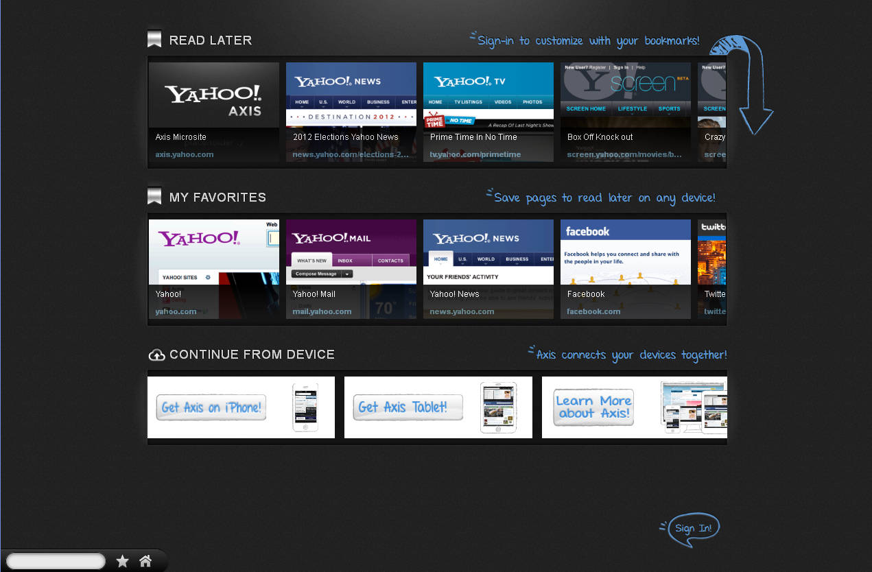 If you’re wondering what it is that makes Yahoo Axis different from everything that’s available now, when you click on the bottom part of your browser window and when the toolbar expands, everything will become clear: