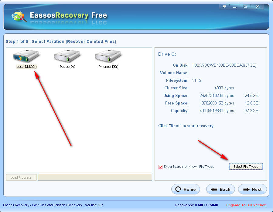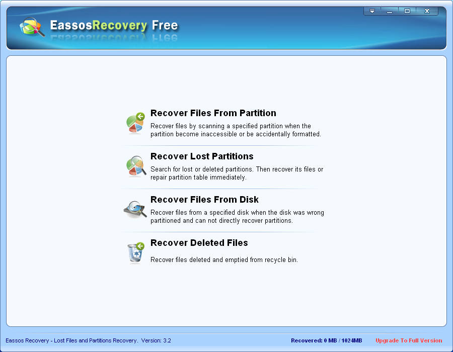 What you see on the image above is the main window which waits for you after completing the installation and running the program. As you can see the program has a very simple design and the main data recovery options can be seen right away. You’ll also notice at the bottom of the window that there’s a message to upgrade to full version and the amount of data recovered with limitation set to 1024MB or in other words 1GB. Free version of Eassos Recovery is limited this way, and if you need to recover more, you’re gonna have to upgrade.