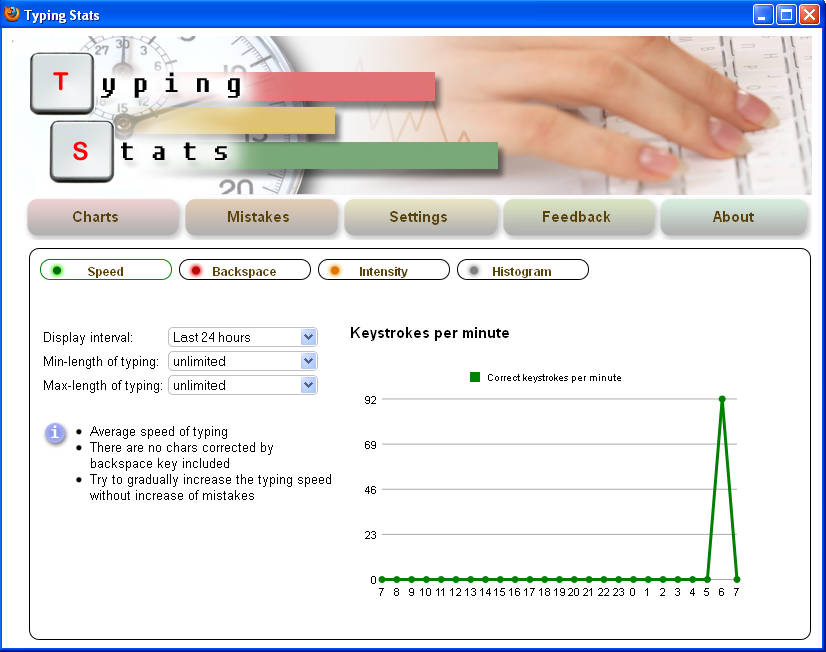 Each one of the previously mentioned categories has it’s own graph, Speed measures how many correct keystrokes per minute you make, Backspace measures how many characters you’ve corrected per minute. Intensity measures the total amount of characters, in other words keystrokes that you make, and last but not least, Histogram measures how much time it took between you typing a character, which is basically another way of how you can track your typing speed.