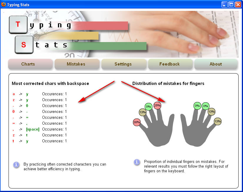 By opening up the Mistakes tab, you can find something really amazing, there’s actually a detailed report on which characters you’re making mistakes the most, and also which fingers are the ones that are most problematic when it comes to missed keys:Letters which you were making the mistake on and also letter in which you made corrections can be seen on the left side, and on the right side there’s a “schematic” of your fingers with percentage of correctness being displayed above them. After you find out which fingers are causing you the most problems for your typing, you can start practicing them more, :). Typing Stats addon is a great way of how you can monitor the quality and accuracy of your writting, it should be installed by every person who’s learning how to type faster, especially those who need it for school.