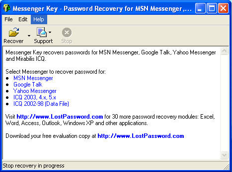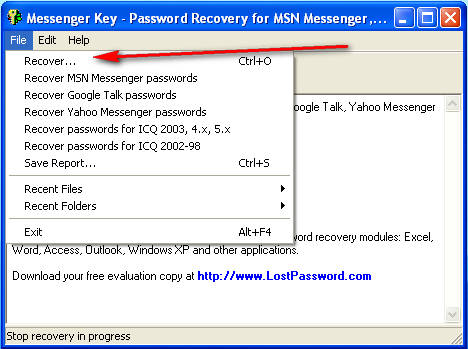 Just like web browsers, when you save a password inside Yahoo Messenger, for example, it will be stored inside a file somewhere on your computer, so that the application can use it next time that you are logging in. Messenger Key will look for these stored passwords, read them out of their files and show them to you.Depending on the program, it might also be necessary to decrypt the password, Messenger Key can do that as well. Something that’s a wise thing to do, after you’ve recovered the password, is to change it. Even though Messenger Key is a trustworthy program, just to be on the safe side change your password and make sure that you remember it this time. If you’ve forgotten your MSN, Yahoo, Google Talk or ICQ password, try to recover it with Messenger Key, it’s very fast and easy to use, and you can have your password in minutes.